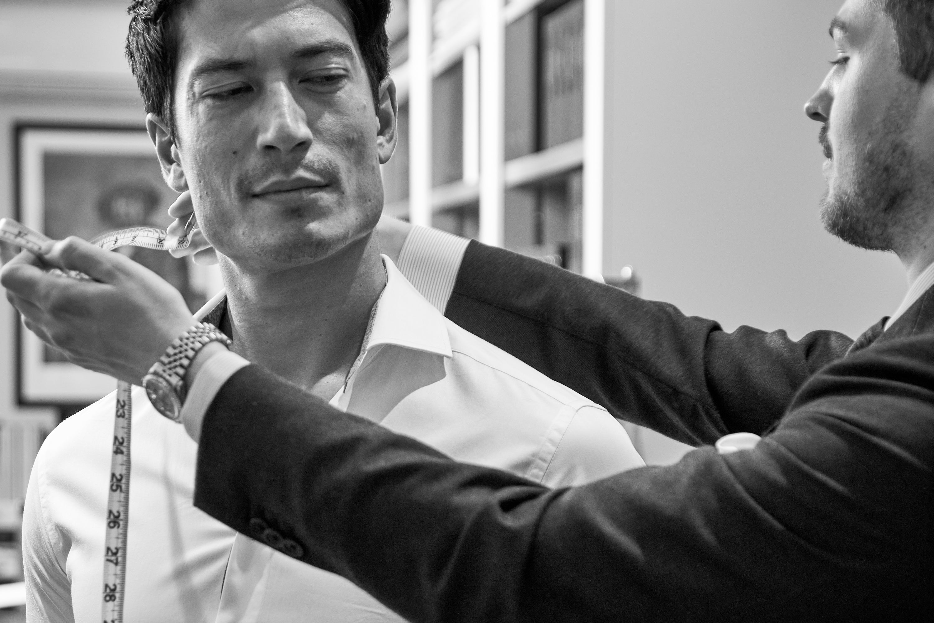 To experience the perfect fit of a Blake Mill made-to-measure cotton shirt, book your appointment with a selected tailor in London or Manchester. Here, your measurements will be taken, and the creation of your custom-fit shirt will begin.
