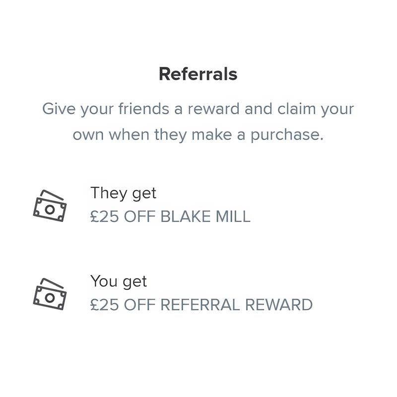 Refer a friend to Blake Mill. They get £25 off their order of £100 or more, and when they place their order, you get £25 off your next shirt!